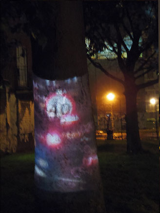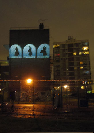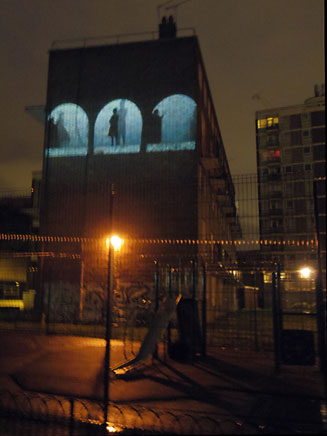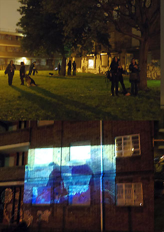 ... as you walk through the soon-to-be demolished Kingsland estate, among the trees and the derelict blocks of flats, multiple video projections appear on the trees, the building and the broken stones ... and you hear sounds, traces of the past and intimations of the present. Video works by Tracey Holland, Glenn Ibbitson, SDNA, Jessica Kolokol, Adrian Shephard; curated by Gillian McIver.